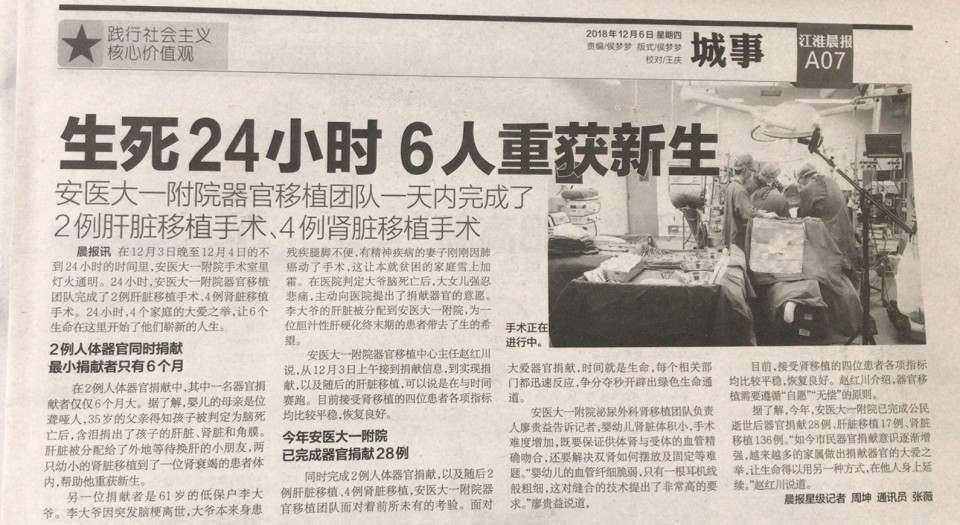 据安徽商报报道,从12月3日早晨起,安医大一附院手术室里连续24小时灯火通明。在此期间,安医大一附院器官移植团队完成了2例肝脏移植手术、4例肾脏移植手术。24小时,安徽、湖北的4个家庭的大爱之举,让6个生命在这里开始了他们新的人生。