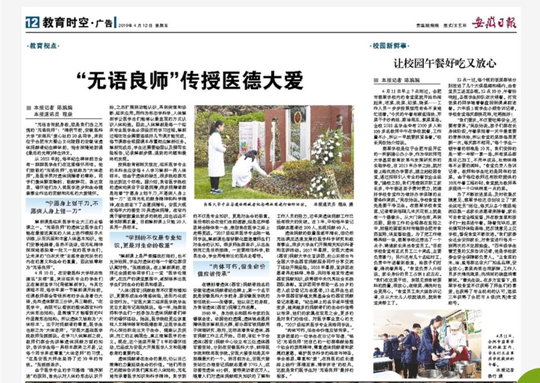 “人体(器官)捐献教育不仅要传播知识,更要形成生命情感体验,进而内化成自觉行为。”安医大第二临床医学院学生党总支副书记高晓妹说。每一年,她都坚持和学生们一起参加为遗体捐献者们举行的缅怀活动。她说,医学院校更应该重视人文精神培育和医德教育,让医学生在内心深处积淀出关于生命、健康以及疾病、死亡的正确观念,真正理解医学的含义。现在,这个连续开展了8年的缅怀活动,已经成为安医大开展医学人文和医德教育的重要内容。
