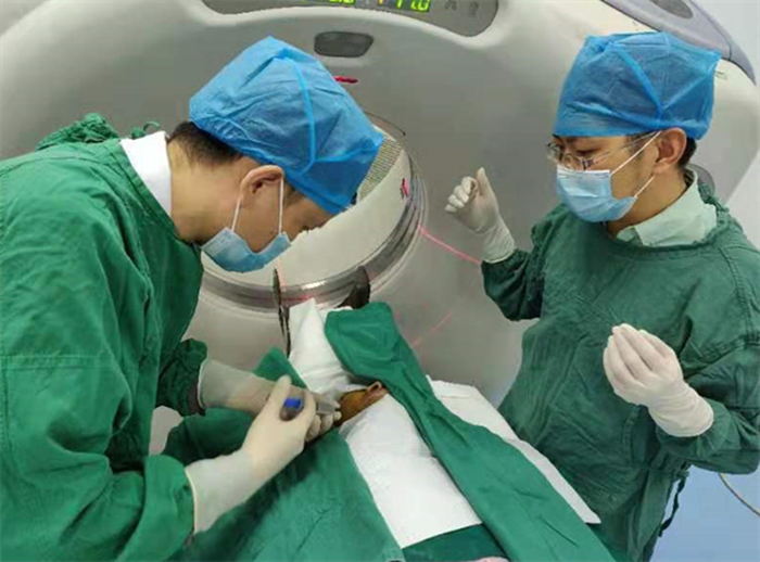 将患者收治入院后,王炎带领疼痛科的医护团队,为病人制定了完善的治疗计划,并结合患者的年龄、病史及身体状况,在与患者沟通商议后选择“CT引导下半月神经节射频热凝术”为患者治疗。