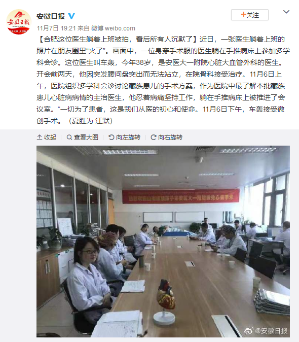 这位躺在病床上开会的医生叫车轰,今年38岁,是安医大一附院心脏大血管外科的医生。开会前两天,他因突发腰间盘突出而无法站立,在院骨科接受治疗。