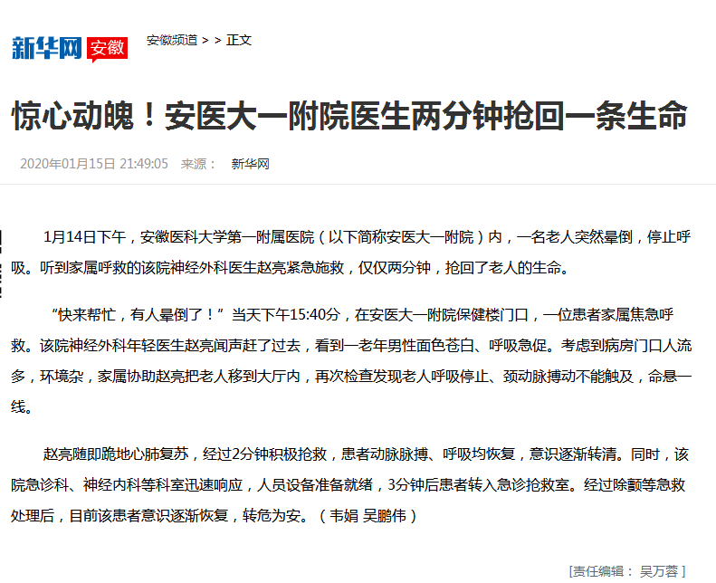 “快来帮忙,有人晕倒了!”当天下午15:40分,在安医大一附院保健楼门口,一位患者家属焦急呼救。该院神经外科年轻医生赵亮闻声赶了过去,看到一老年男性面色苍白、呼吸急促。考虑到病房门口人流多,环境杂,家属协助赵亮把老人移到大厅内,再次检查发现老人呼吸停止、颈动脉搏动不能触及,命悬一线。