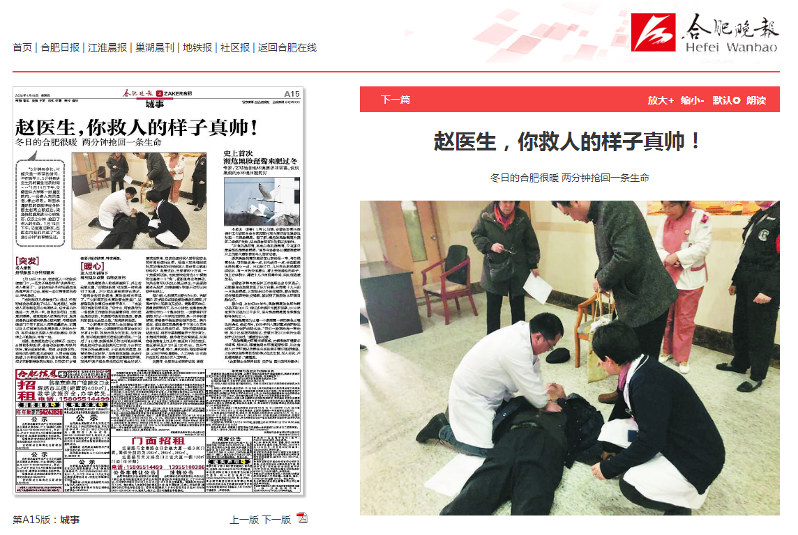1月14日15:40,在安医大一附院保健楼门口,一名女子焦急呼救“快来帮忙,有人晕倒了”。该院神经外科年轻医生赵亮闻声赶了过去,看到一老年男性面色苍白、呼吸急促。