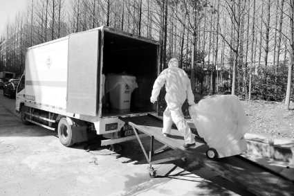 2月17日,记者在安医大二附院医疗垃圾处理站看到,工作人员将新冠肺炎医疗废弃物从隔离病房运送来,进行扎带扫码,垃圾信息入库。