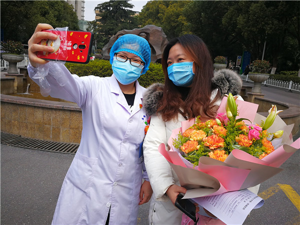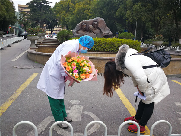 2月24日上午,安医大一附院一位新冠肺炎患者出院时和她的主管医生之一苏丽自拍留念,并向苏丽医生赠送鲜花鞠躬以表感谢,苏丽医生顺势鞠躬回礼。医患之间的尊重和互爱,再现了百年前“梅滕根”之礼。