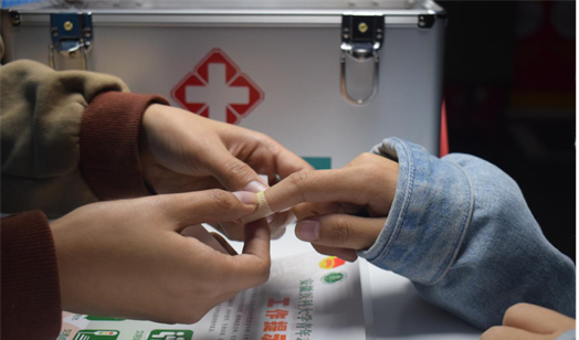 “运动时候不小心摔了一下,手指擦伤了,到志愿服务岗亭,志愿者们细心地对伤口进行消毒,并用创可贴贴好。岗亭的应急药箱里有创口贴、医用退热贴、棉签、消毒酒精、口罩、烧烫伤药膏等,药品很齐全,志愿者更贴心。”