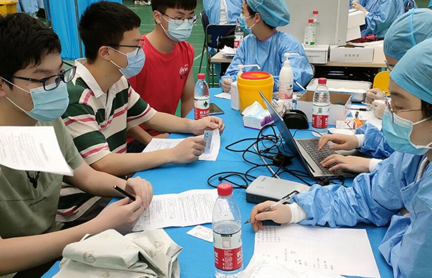 新冠疫苗接种现场,医护人员为学生登记信息。袁学艺摄