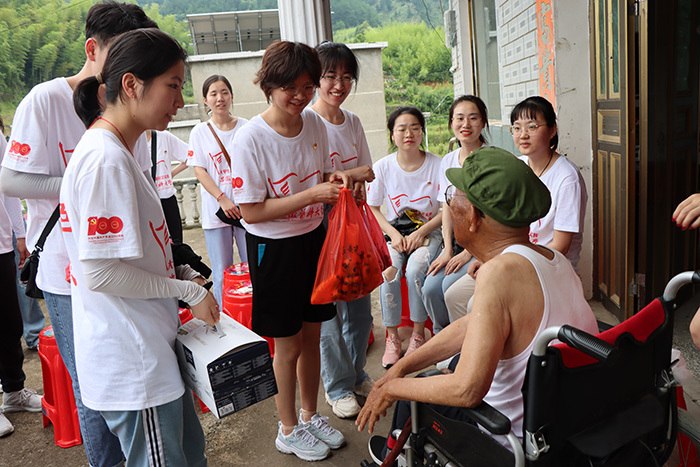 实践队员在刘畈乡为抗战老兵詹绪凤送上慰问品