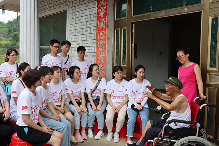 实践团队来到太湖县刘畈乡,瞻仰刘邓大军高干会议旧址,参观旧址展陈,学习革命历史,学生党员重温入党誓词,坚定理想信念。队员们走进刘畈乡九田村、江塘乡龙山村,关爱慰问两位92岁高龄的抗美援朝老兵詹绪凤、王文端,为老兵量血压、送上慰问品,与老兵一起合唱《中国人民志愿军战歌》,聆听老兵讲述抗战故事,接受革命传统教育。