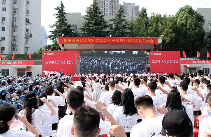 坐在轮椅上报到的“乐观男孩”、医学信息工程专业2021级新生朱守洋也在母亲的陪伴下,从东校区赶来参加典礼。在教师代表和新老生代表领誓下,朱守洋和现场4600余名同学一起庄严宣读医学生誓词。