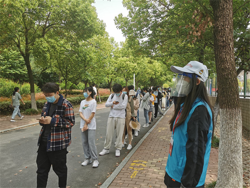 学生参加志愿服务,维持核酸检测秩序。 于乐琪摄