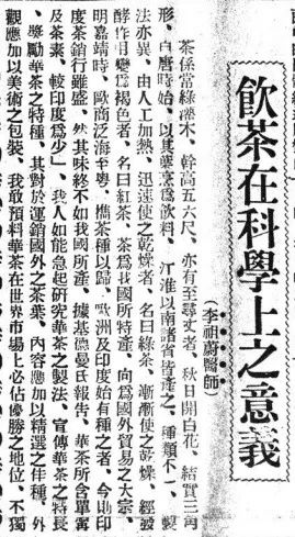 上世纪30年代 ,李祖蔚发表在报纸上的《饮茶在科学上之意义》