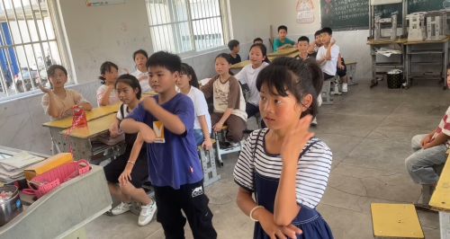 在另一个班同步进行的《YES OK》手势舞也同样引发了小朋友们的兴趣。伴随着欢快积极的歌曲,学生们在教室内学习手势舞,不仅让学生们学习到一种新的才艺,还降低了在室外跳舞中暑的可能性。志愿者王晶带领同学们在音乐中挥舞手臂,学生们也在左右摆荡中成长学习。