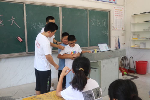 上午9点,为了提高于集乡留守儿童的安全意识和防范能力,“三下乡”团队在支教活动中安排了安全教育课程,在志愿者李子祥的安全教育示范课中拉开了序幕,李子祥与王井启两位志愿者的“海姆利克急救法”的演示引来了小朋友们的阵阵惊叹,并通过击鼓传花的游戏规则带着小朋友们一起熟悉巩固基础的急救知识,课堂的教学模式以互动为主,轻松活泼的气氛增加了课堂效率,促进孩子们积极与志愿者交流,学习知识。