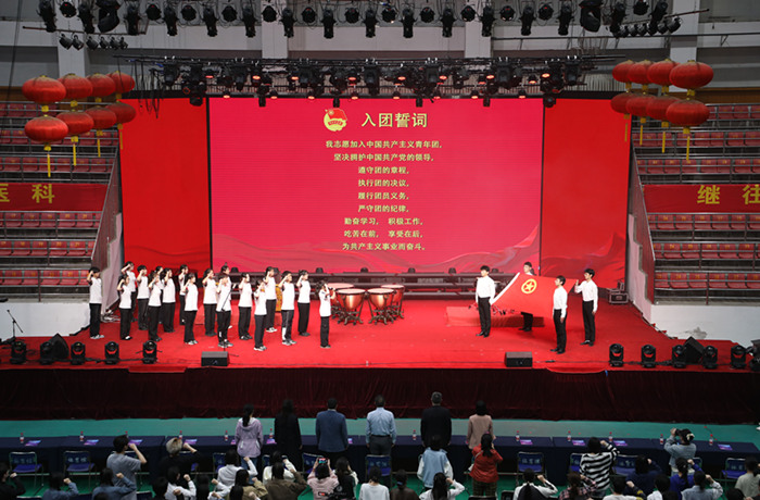 艺术团课在全场团员重温入团誓词的铮铮誓言中拉开帷幕。在校优秀共青团员带领下,全体团员面向团旗,紧握右拳,许下慷慨激昂的青春誓言。