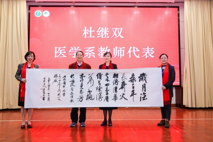 杜继双作为教师代表发言,深情回忆了与校友们相处相知的美好时光。他还向学校赠送了本人作词并创作的一幅精美书法作品,表达1984届校友对母校的深厚情感和美好祝愿,也希望校友们永葆母校情怀,秉承安医精神,不断创造新辉煌。
