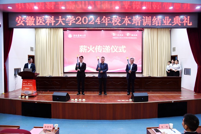 学校首批“徐叔云讲席教授”陶芳标教授、药学院孟晓明教授、思政辅导员曹磊磊作为教师代表,共同完成了薪火传递仪式,象征教育家精神和师德风范代代相传,激励新教师不忘初心,砥砺前行。炎症免疫性疾病安徽省实验室新入职教师陈鑫作为代表发言,分享了参加校本培训的收获与体会,表达了对医学教育事业的热爱和承诺。