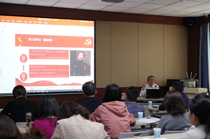 校党史学习教育理论宣讲团成员、马克思主义学院崔兰海副教授受邀担任主讲人,作了题为《百年党史之中国共产党百年现代化历程》的学习辅导报告。他以“中国现代化的起点”为切入点,从传统与现代、民主与共和、独立与富足、复兴与圆梦四个方面,介绍了现代化的挑战期、巩固期、全面展开期和新阶段四个时期的内容和特点。他表示,要树立正确的历史观,从历史文化中汲取智慧与力量;要坚定“四个自信”,坚持走好中国特色社会主义现代化这条康庄大道。图文并茂的内容以及深入浅出的讲解让现场师生接受了一次意义深刻的教育。