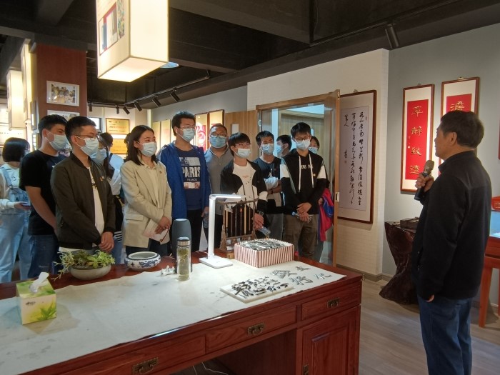 非遗作品绘党史,现场聆听忆峥嵘。该院师生学生代表前往合肥市瑶海区明光路街道党群服务中心,现场感受非遗传承人们用烙画、核雕、铁字等非遗技艺创作的一批以庆祝建党百年为题材的非遗作品。其中,“为人民服务”铁字画作品非常醒目,创作者说:“‘为人民服务’是中国共产党的根本宗旨,用铁字画工艺制作出来更加体现了这一宗旨的铁性;这副字画也没有上色,显示了共产党人的本色。”师生积极参与、兴致高昂,聆听省级技艺大师阐述红色真情,并通过现场制作加深了对百年党史的认识,坚定理想信念。