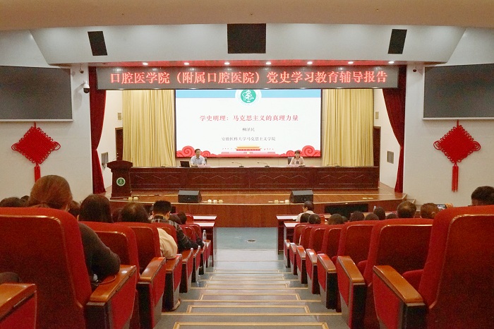 5月8日下午,口腔医学院(附属口腔医院)在校图书馆第一学术报告厅举办党史学习教育报告会,该院党委书记王润玲主持会议,马克思主义学院院长、院党委副书记柳泽民受邀作题为《学史明理:马克思主义的真理力量》的专题报告。