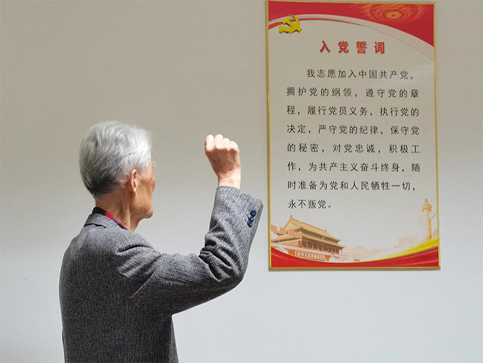 今年是建党100周年,郭老仿佛对党有说不完的话:“我的一生都在践行对党的承诺,听党话,跟党走,时时处处事事忠于党、忠于人民,始终严格地要求自己,勤勤恳恳地为党的事业奋斗,为人民服务。”会议室内,郭老站起身来,面向入党誓词庄重地举起右手,洪亮而坚定的声音再次响起,“我志愿加入中国共产党,拥护党的纲领,遵守党的章程,履行党员义务,执行党的决定,严守党的纪律,保守党的秘密,对党忠诚,积极工作,为共产主义奋斗终身,随时准备为党和人民牺牲一切,永不叛党。”