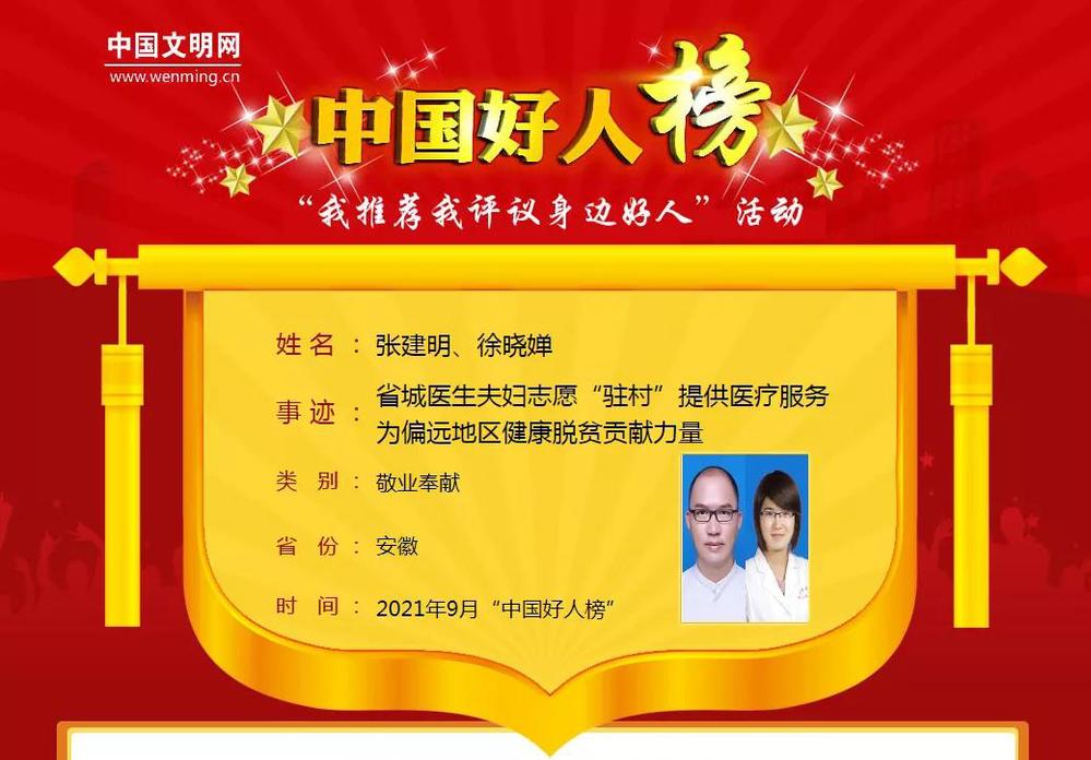 日前,中央文明办发布了2021年9月“中国好人榜”,安徽省11人入选当月榜单。我校第二附属医院老年心血管内科医生张建明夫妇以其志愿参加“百医驻村”脱贫攻坚任务、为偏远山村健康脱贫做出重要贡献的事迹而入选,获评“中国好人”荣誉称号。