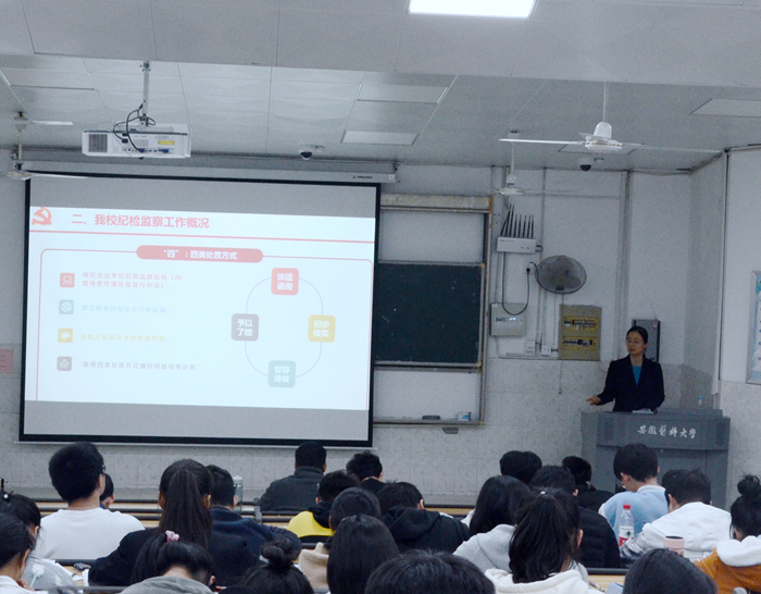 黄新美从党内纪检监察体系的诞生、完善、改革及党风廉政建设和反腐败工作取得的历史性成就等方面,系统回顾了中国共产党的百年纪律建设史。她指出,党的百年历史是一部不断自我革命的历史,纪律建设和作风建设是管党治党建设党、永葆党的生机活力的重要法宝,新时代青年学生要自觉强化作风纪律,增强责任感、使命感,扣好人生第一粒扣子,主动担负起民族复兴的时代使命。课上,黄新美还围绕持续强化政治监督、做深做细日常监督、扎实开展重点监督、一体推进“三不”体制机制建设、深化新一轮“三个以案”警示教育、推动巡视整改、深化纪检监察体制改革等,向同学们介绍了我校近年来纪检监察工作开展情况。