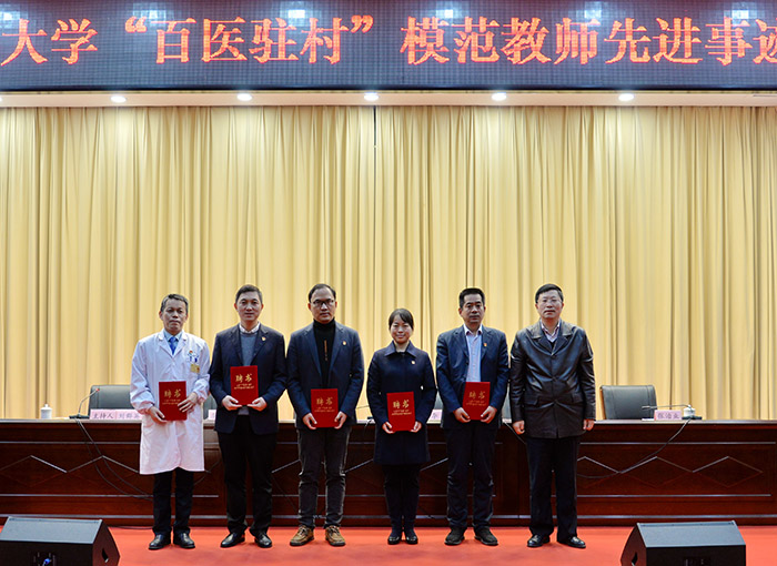 11月17日下午,我校“百医驻村”模范教师先进事迹报告团首场报告会在图书馆第一学术报告厅举行。驻村健康扶贫两年时间、不辱使命载誉归来的5位“百医驻村”模范教师代表,用他们扎根基层、服务人民的感人故事,给我校教师和辅导员上了一堂特殊的党史学习教育“专题党课”和“师德师风教育课”。校党委副书记刘群英主持报告会,并为“百医驻村”模范教师代表颁发学校思政理论课(实践)兼职教师聘书。