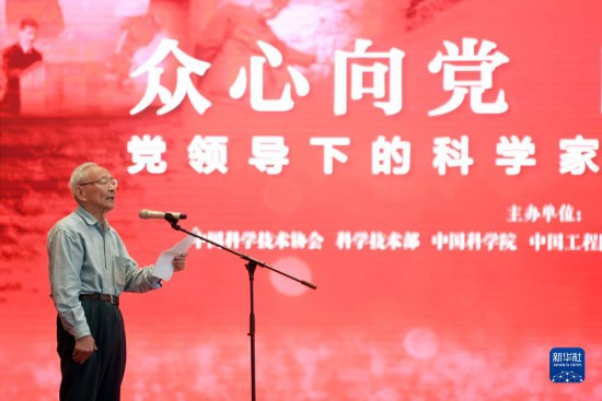西迁老科学家代表潘季在“众心向党 自立自强——党领导下的科学家”主题展开幕式上致辞(5月24日摄)。 新华社记者 金良快 摄