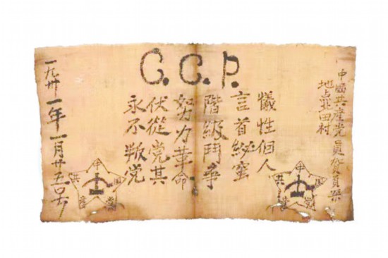 在中国共产党历史展览馆,陈列着中国共产党现存最早的入党誓词,这就是江西永新农民贺页朵1931年写在一块土布上的入党誓词。这件文物纵26.5厘米,横74厘米,收藏在中国国家博物馆。中间是入党誓词,从右至左分别是:“牺牲个人,言(严)首(守)纟必(秘)蜜(密),阶级斗争,努力革命,伏(服)从党其(纪),永不叛党”;正面上方写着中国共产党的英文缩写“CCP”;誓词左右两边下方分别画着一个不规则的五角星,星内画着镰刀和锤头图案,两个五角星的五个角内各写着“中国共产党”五个字。右侧边沿的落款是“中国共产党员贺页朵地点北田村”,左侧边沿写着时间“一九三一年一月二十五号”。
