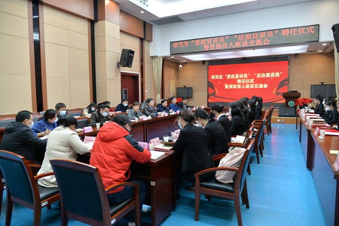4月1日下午,研究生“思政宣讲员”“法治宣讲员”聘任仪式暨资助育人工作座谈会在知行楼一楼会议室召开。校党委副书记刘群英出席会议并讲话。