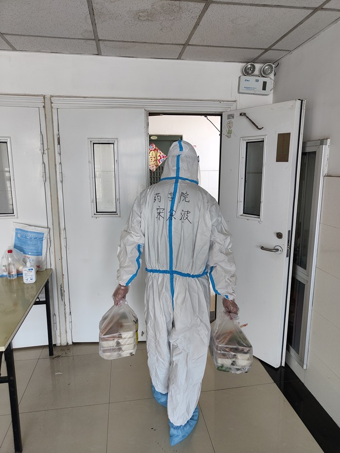 4月20日,校园内出现密接,学校迅速启动应急响应预案,尚美楼3号楼和4号楼共三个楼层封控管理,学生按照规定开始“足不出户”。为了保证每位学生都能吃到热乎饭,研究生辅导员们、导师们纷纷穿上防护服,化身“大白”配送员,将饭菜送到每一个研究生手上,药学院辅导员宋余波每天刚到饭点,就奔忙着把饭菜一袋袋运到不同的隔离楼层,每次送完饭都是一身的汗……