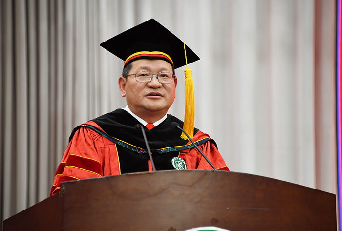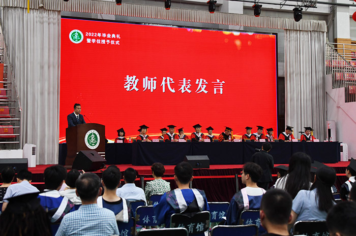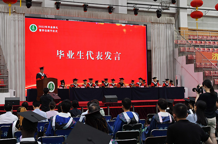 药学院副院长、博士生导师孟晓明教授作为教师代表发言,祝福毕业生在今后永不失少年的质感,意气风发、斗志昂扬地开启新一段旅程。来自护理学院的杨金、公共卫生学院的朱华龙和国际教育学院的马莎三位同学,分别作为本科生、研究生、留学生代表发言。