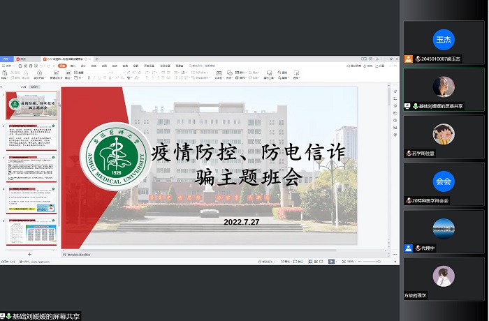 7月27日晚,基础医学院召开全体研究生 “疫情防控、防电信诈骗” 线上主题班会,进一步教育引导研究生树立正确的安全观,增强研究生疫情防控、生命财产、网络安全等风险防范意识和风险应对能力,扎实做好暑期研究生的安全教育和管理。