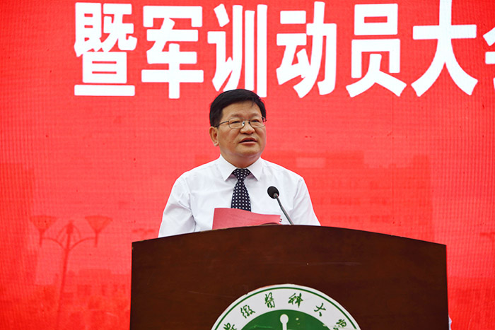 校党委书记顾家山,校党委副书记刘群英,副校长余永强、梁朝朝、肖圣龙、吕雄文,校纪委书记、省监委驻我校监察专员黄新美等出席开学典礼并在主席台前排就座。顾家山作了题为《争做时代新人,堪当大国良医》的主题致辞,刘群英主持大会,余永强宣布军训团组成人员名单,肖圣龙代表学校向军训团授旗。我校杰出校友、法国国家医学科学院院士何国伟作为杰出校友代表致辞。