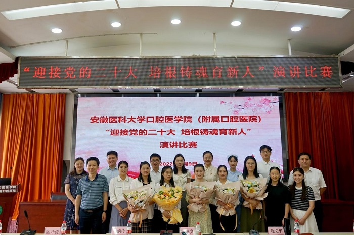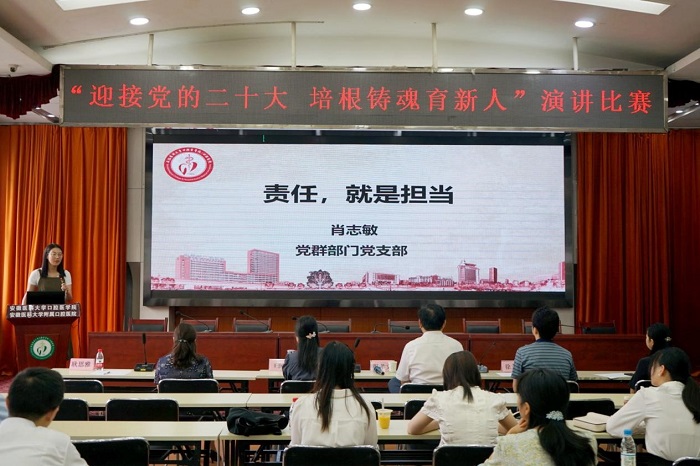 近日,口腔医学院举行“迎接党的二十大,培根铸魂育新人”主题演讲比赛,该院党委书记王润玲到场观摩,学校附属小学校长、马克思主义学院思想政治教育专业硕士生导师程孝文教授,该院副院长徐文华等受邀担任评委。