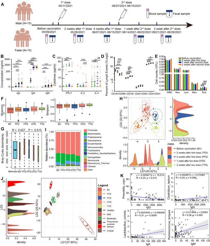 该研究招募了30名健康志愿者,对其两剂科兴疫苗接种前后的血液和粪便进行高频采样,通过血常规、流式细胞术和ELISA等方法检测志愿者在疫苗接种过程中的血液免疫学指标、淋巴细胞亚群、细胞因子和抗体水平,并通过全基因组测序解析志愿者肠道菌群的结构。