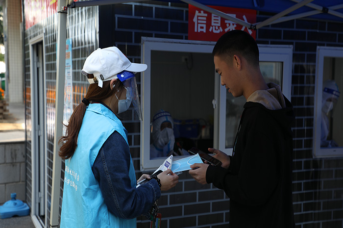 互动答题学习党的二十大报告、维持核酸检测现场秩序、提醒进入食堂的师生正确佩戴口罩……校园里,来自各学院的青年志愿者们正在忙碌着。