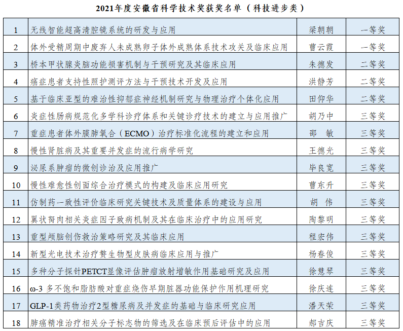 我校此次共有25项成果获奖,再创历史新高。我校自2018年、2019年连续两年荣获两项安徽省科学技术奖一等奖后,2020、2021年连续两年获得三项安徽省科学技术一等奖奖励。此外,我校还获得2021年度安徽省科学技术奖二等奖4项,三等奖18项。