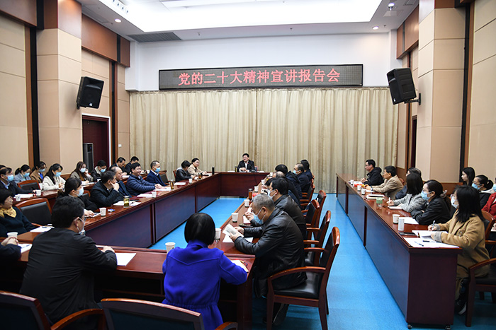 11月23日上午,校党委书记顾家山在知行楼一楼会议室,面向机关党委党员干部宣讲党的二十大精神。他强调,要进一步学习宣传贯彻党的二十大精神,学懂弄通习近平新时代中国特色社会主义思想,深刻领会“两个确立”的决定性意义,进一步增强“四个意识”、坚定“四个自信”,做到“两个维护”,以更高站位、更大决心、更强毅力推动学校事业更高质量发展,为加快建设国内一流高水平医科大学,服务支撑教育强国、科技强国、人才强国、健康中国和现代化美好安徽建设而不懈奋斗。