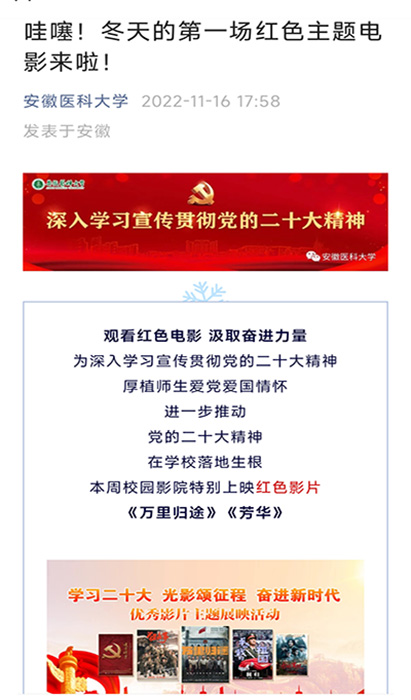为全面学习宣传贯彻落实党的二十大精神,加强理想信念教育,厚植师生爱党爱国情怀,我校开展“学习二十大、光影颂征程、奋进新时代”优秀影片主题展映活动。观影活动以党的二十大精神为指引,把主旋律电影红色教育作为贯彻落实我校学习宣传贯彻党的二十大精神实施方案的具体举措之一,以充分发挥优秀电影的宣传教育、思想引导作用,进一步弘扬社会主义核心价值观,推动党的二十大精神在学校落地生根、开花结果。