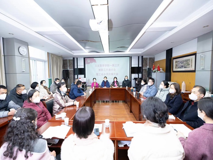 12月14日下午,人文医学学院召开一届三次教职工代表大会暨工会会员代表大会。该院党委书记杨秀兰主持会议并作2022年度分工会工作报告,院长骆广东作2022年度院长工作报告。