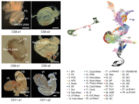 研究者收集了 CS8-CS11 时期(E20-E29)的食蟹猴胚胎,利用10X 单细胞转录组测序技术捕获了 56636 个胚胎来源的单细胞转录组并进行生物信息学分析,明确定义了食蟹猴该时期的 38 个主要细胞类群,绘制了目前国际上第一张灵长类 CS8-CS11 胚胎的高通量单细胞转录组图谱。揭示了原肠运动和三胚层分化(神经管、体节、肠管等的发育)过程中重要细胞类群的特征及其谱系发生和调控机制。