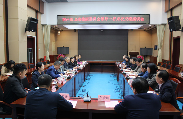 3月9日上午,宿州市卫生健康委党组书记、主任牛慧琴等一行来我校调研,校党委书记顾家山亲切会见来访人员。校党委常委、副校长余永强出席座谈会,双方就加强校地合作、促进毕业生就业、推动优质医疗资源下沉等进行交流座谈。