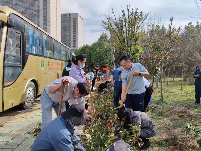 在植树现场,党员同志们个个干劲十足,以饱满的热情投入到植树减碳的绿色行动中。大家互相配合,刨坑、浇水、扶苗、培土、压实,现场一片繁忙有序、热火朝天的景象。枝头花苞初现,泥土散发清香,在一个多小时紧张劳动中,3000棵红叶石楠小苗在南校区 “安家落户”。