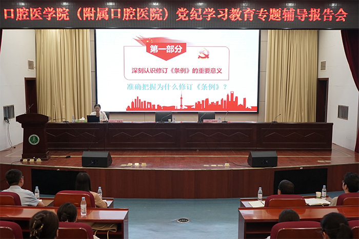 6月12日下午,校纪委书记、省监委驻校监察专员黄新美为口腔医学院(附属口腔医院)教职工党员,作题为《学习贯彻〈中国共产党纪律处分条例〉》专题辅导报告。