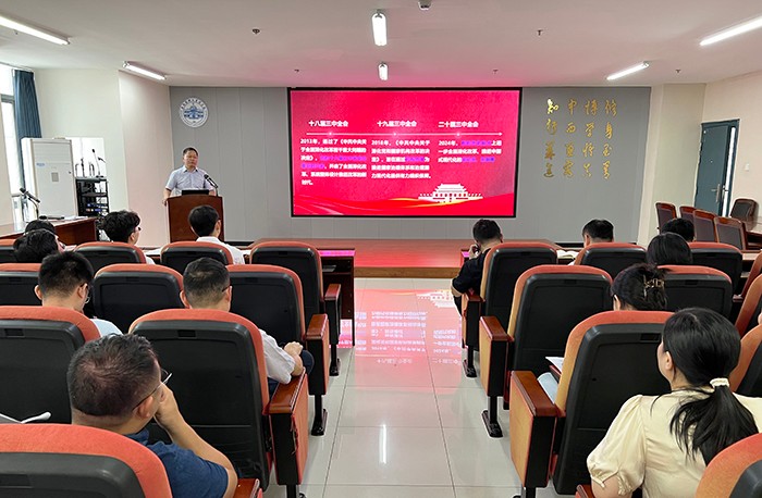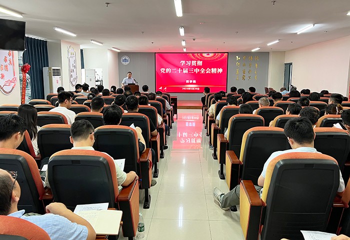 8月30日上午,药学院组织全体教职工学习党的二十届三中全会精神。学院党委书记骆广东以“学习贯彻党的二十届三中全会精神”为主题,为全院教职工讲授专题辅导报告。执行院长孟晓明主持报告会,院领导班子全体成员出席会议。