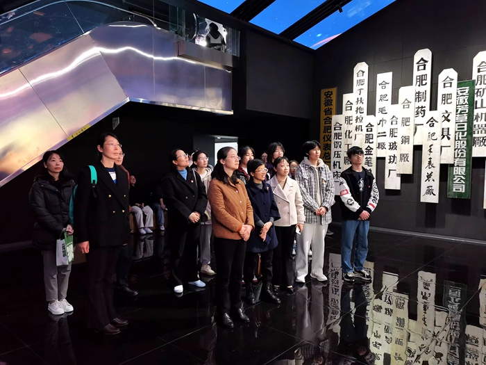 合肥城市记忆馆由原合肥市政府大楼改造而成,集中展示了1949年至今合肥经济社会发展成果。全体师生党员依次参观了“合肥不错”“工业璀璨”“街市熙攘”“文化兴盛”“科教兴市”“城建蝶变”六个主题板块,从历史沿革、工商业发展、科教文化、城市生活等维度,近距离了解合肥城市发展的成就。一个个富有年代感的场景和老物件勾起了大家的回忆,光影技术和数字化互动则让大家感受到合肥城市发展的高光时刻。
