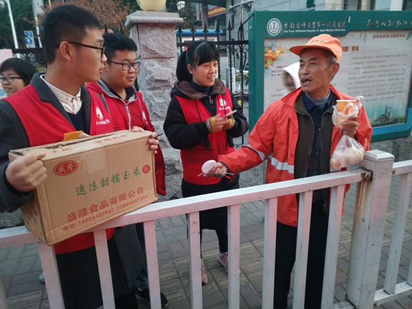 积极学习党的十九大精神的热潮下,第二临床医学院 17 级临床专业开展 “爱心助力中国梦,青春诠释十九大”社会实践活动。同学们为那些在全面建设小康社会道路上默默奉献的 “城市美容师” 献爱心、送温暖。