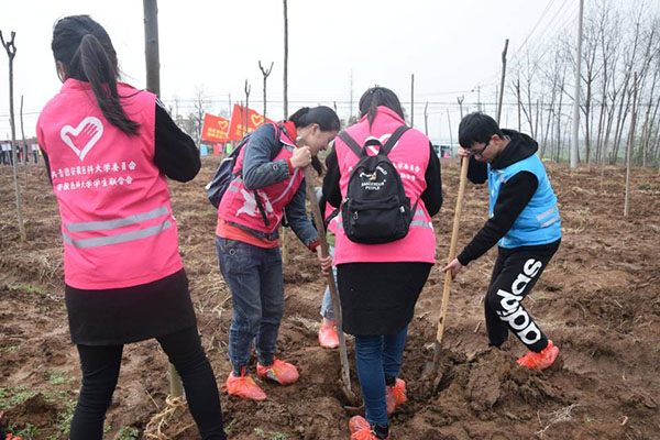 用铁锹挖坑、放树、填土,一棵棵充满生机和希望的树苗很快重回土地的怀抱。经过志愿者们热火朝天的工作,很快,一片树林就成型了。大家纷纷与自己种的树苗合影留念。看着一棵棵柔弱却挺拔的树苗扎根于泥土中,想到日后它们会投下成片的绿荫,志愿者难掩心中的喜悦:“虽然活动已经结束了,但我们依然会坚持我们的 “绿色之行”,继续为环保工作贡献自己的力量”。