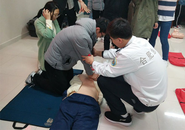 此次讲座分为理论知识与操作技能教学两大部分。赵刚重点讲授了如何判断并快速识别病情的急救知识,包括心肺复苏法(呼吸停止)、海姆立克急救法(食物卡喉)、外伤救护的处理办法,并通过真实案例讲解急救中存在的误区。袁哲佩利用现场模拟的方式,全面展示了突发事故的现场救助流程。讲解完毕,同学们积极参加实操演练,在仿真的情景下进一步熟悉急救知识、熟练掌握急救技能。